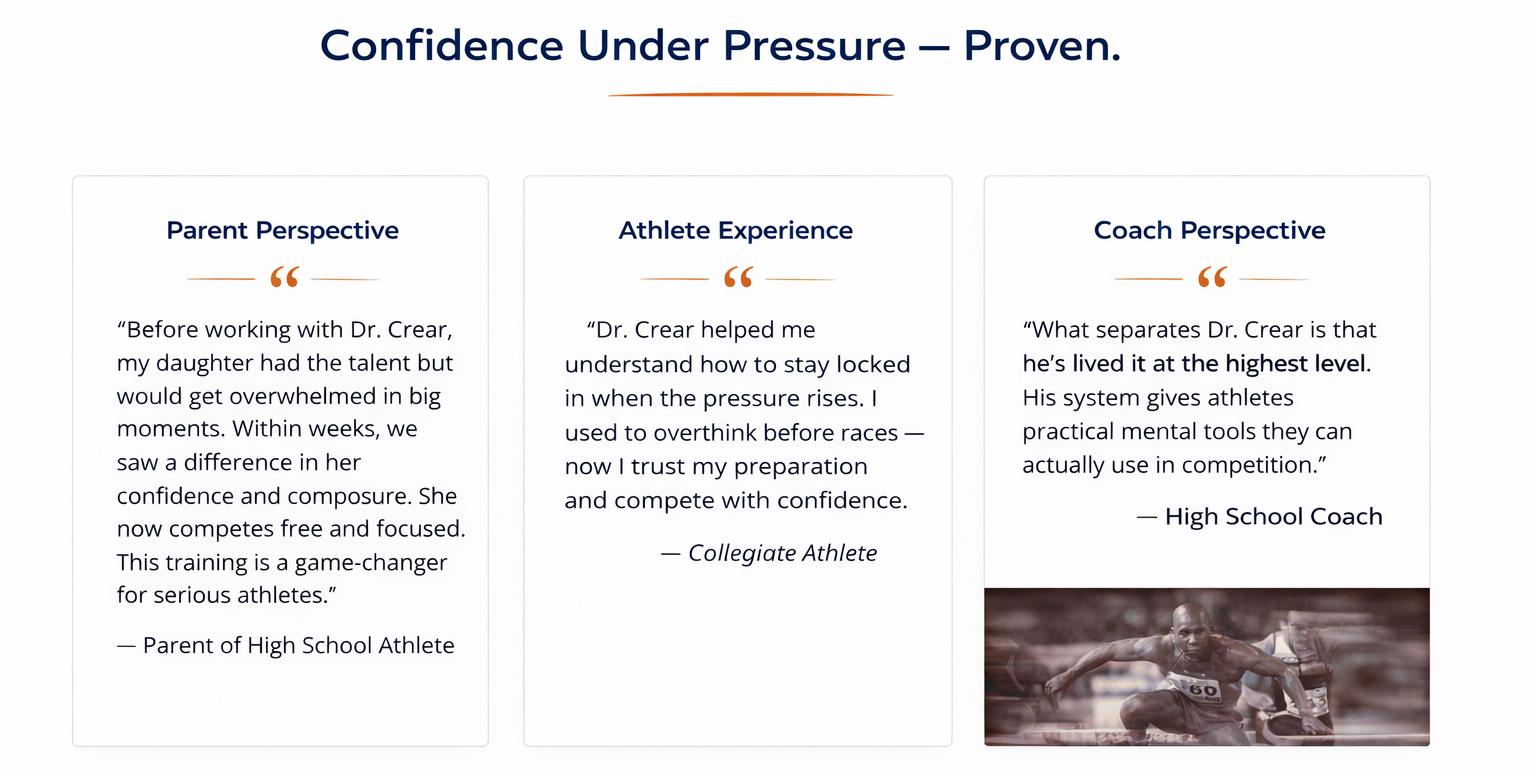 Dr. Mark Crear is a two-time Olympic medalist and performance psychology specialist who trains athletes to compete with confidence when it matters most.